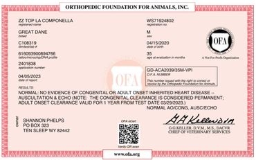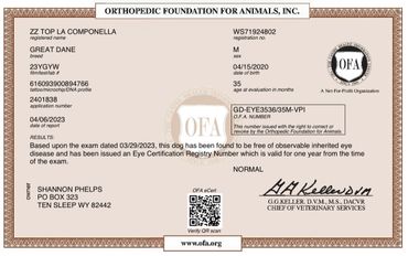 Glock is my one in a million Great Dane studs that we imported from Poland. His bloodlines speak for themselves as his pedigree is stacked with multiple championships. I have waited a very long time to own a Great Dane like him and he was well worth the wait! Glock is my hiking buddy and goes everywhere with me exploring the beautiful and breathtaking Wyoming mountain ranges created by God. He is a great family dog and just a joy to have in our family. He has a phenomenal disposition to him with correct structure and movement. He weighs 170 pounds and is 33” tall at the shoulders. Glock is PennHip and OFA Echocardiogram, Thyroid, and CAER Eye health tested (CHIC#182073). More pictures of Glock, his health testing, pedigree, and color testing are right below.
